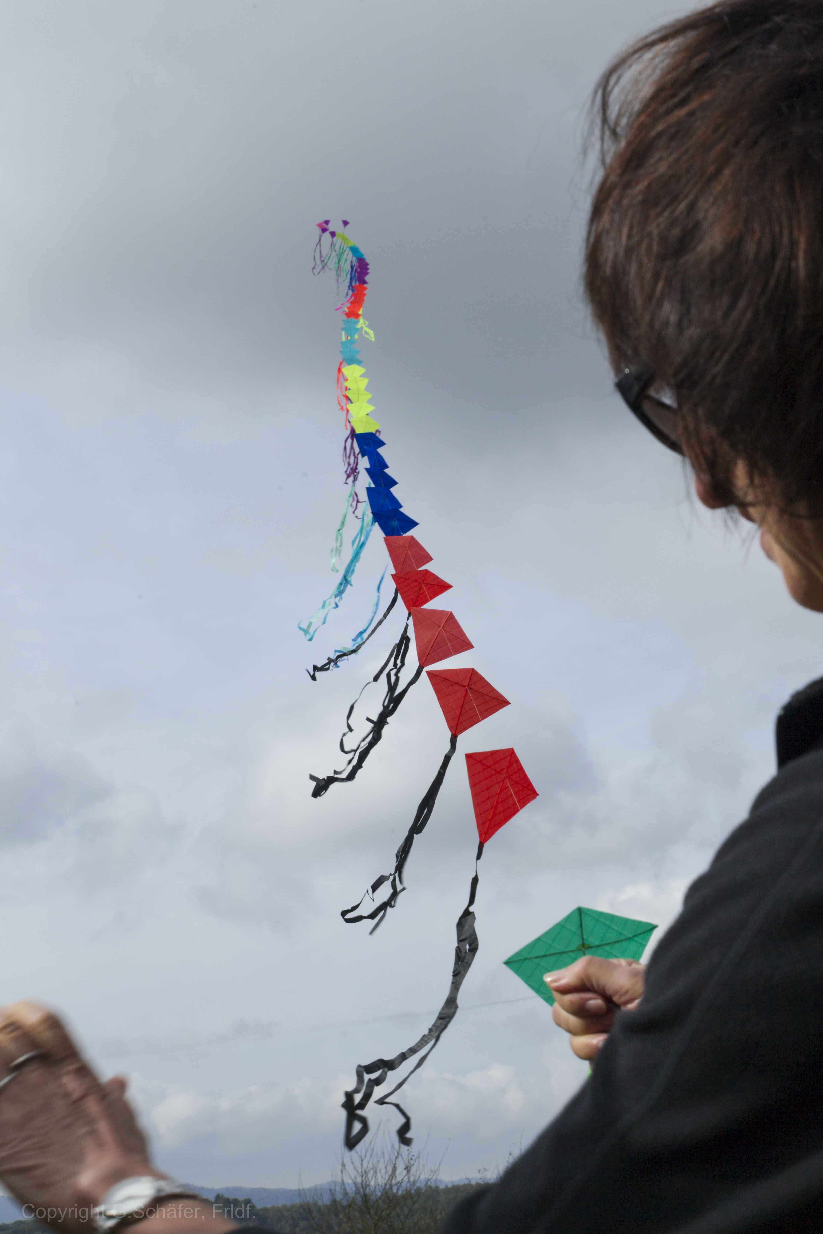 Links unsere 2024 gefertigte kleine Sky-GiAnts-Eddykette. Wann immer es eine leichte und gleichmäßige Brise zulässt, soll sie zur Präsentation unseres Namens dienen. Rechts unsere Eddy-Start- und Windaufklärerkette, bestehend aus sechs kleinen Eddys. Unten dann die komplette Eddykette: die sechs Starteddys mit weiteren 50 angehängten Mini-Eddys. Obwohl alle Eddys nur 105 mm Spannweite besitzen und 95 mm hoch sind und damit auch der Größe entsprechend ziemlich windempfindlich, haben sie keine Waagenschenkel sondern eine Ein-Punkt-Waage. Lediglich der oberste Eddy besitzt zum Austarieren eine einstellbare Zwei-Punkt-Waage. |